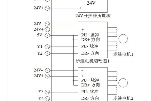 兩軸接線服電機(jī)法要注意步進(jìn)電機(jī)驅(qū)動(dòng)器1中pu+脈沖和dr+方向連接是步進(jìn)電機(jī)2中pu+脈沖和dr+方向,其中步進(jìn)機(jī)1中pu+脈沖還連接著5v。