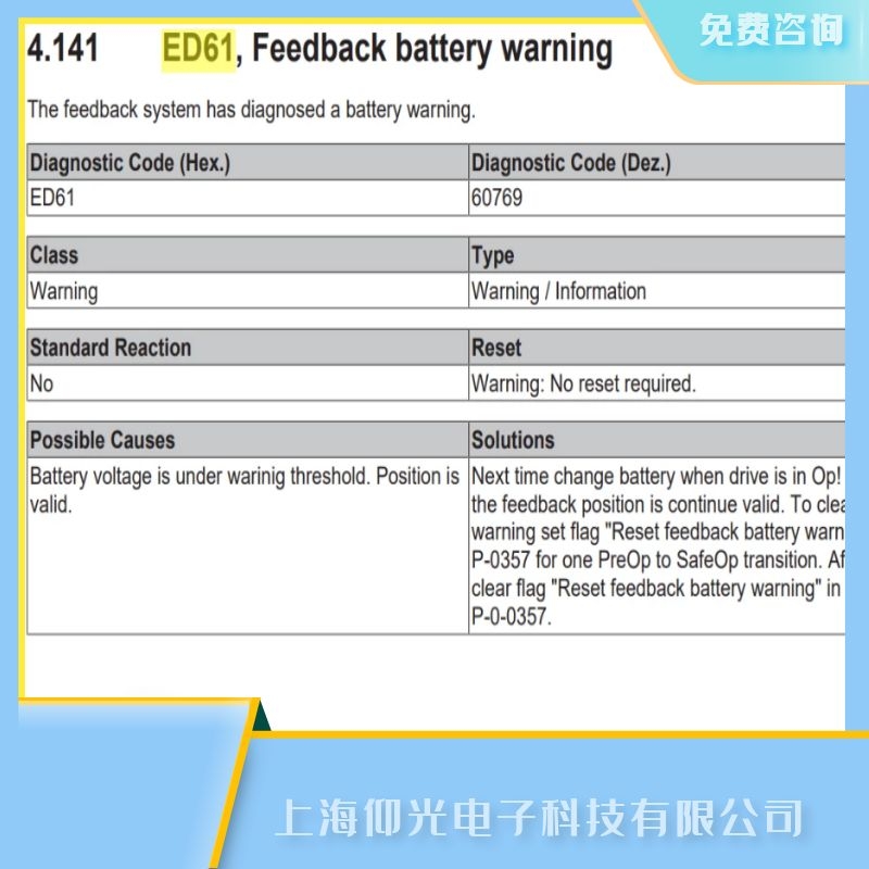 beckhoff倍福伺服放大器報(bào)ED61反饋電池警告故障維修解析: